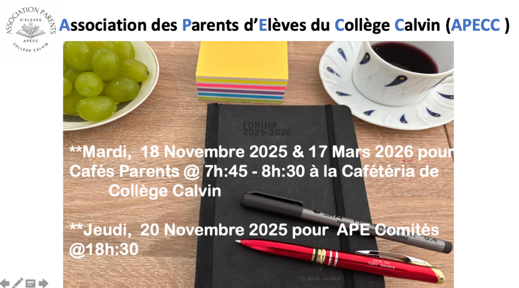 Les parents d’élèves sont les bienvenus pour assister à l’Assemblée Générale ainsi qu’aux réunions lors desquelles vous pourrez poser vos questions. Nous sommes aussi heureuses de recevoir des suggestions de thèmes à aborder lorsque nous rencontrons les divers acteurs du DIP.